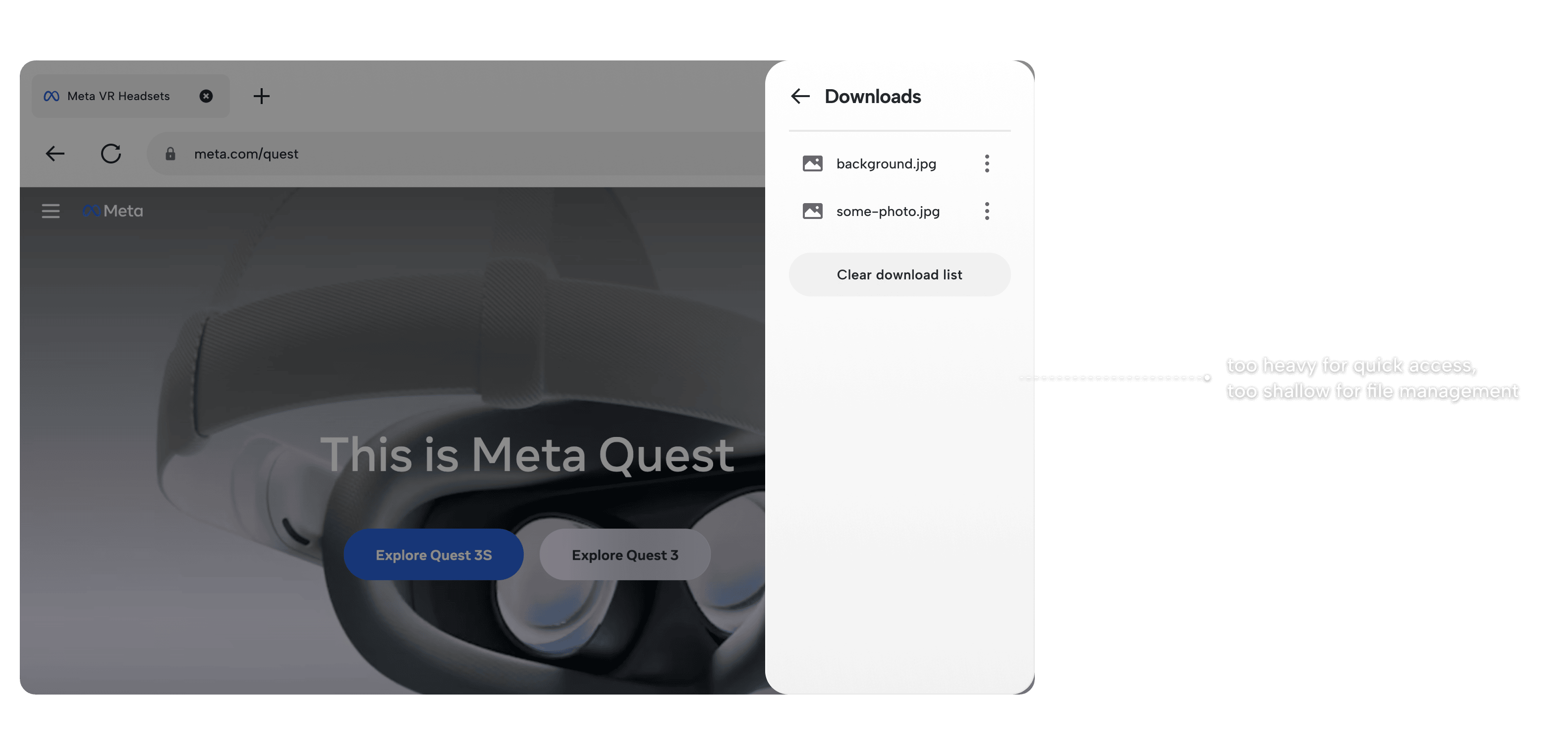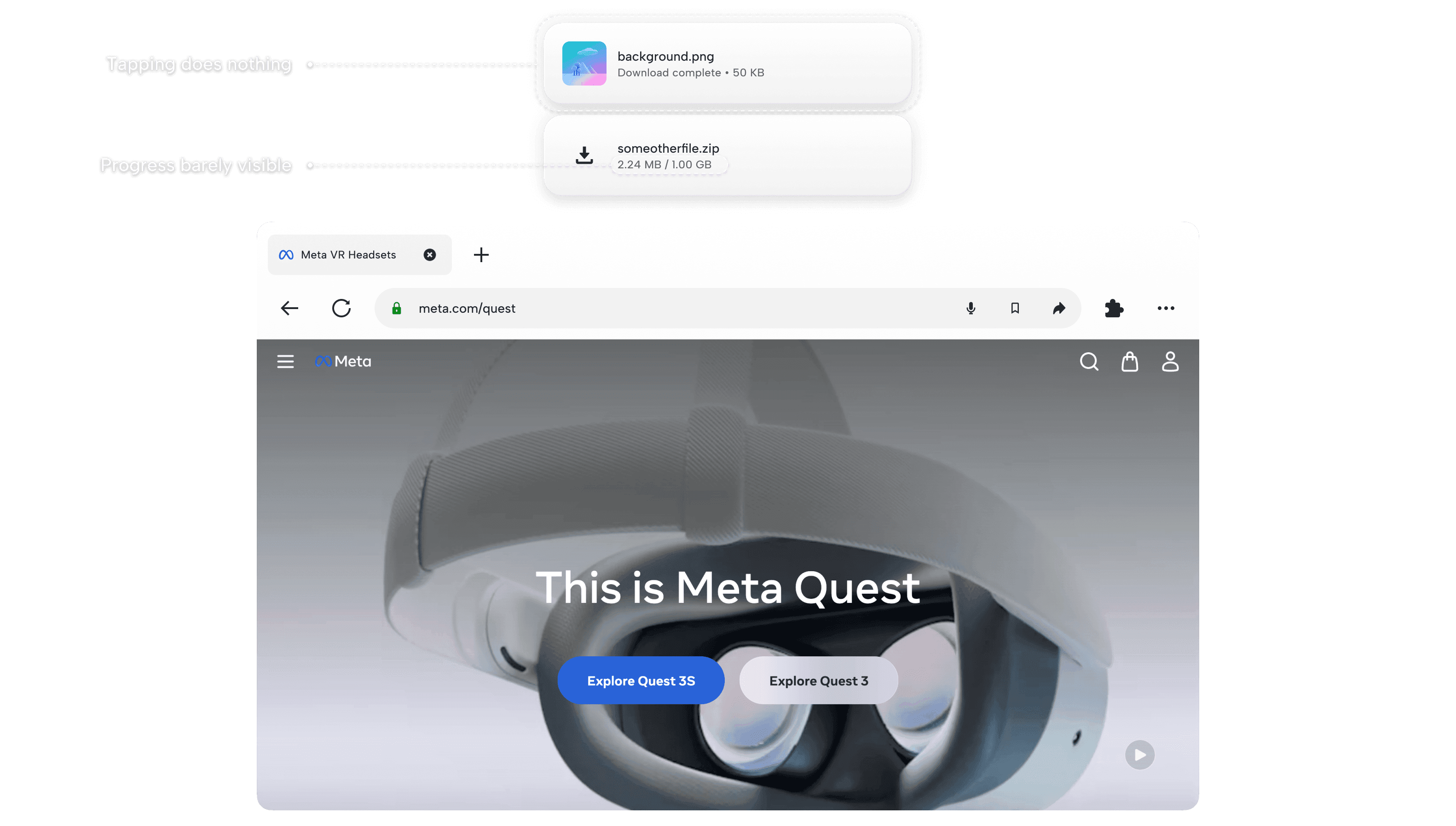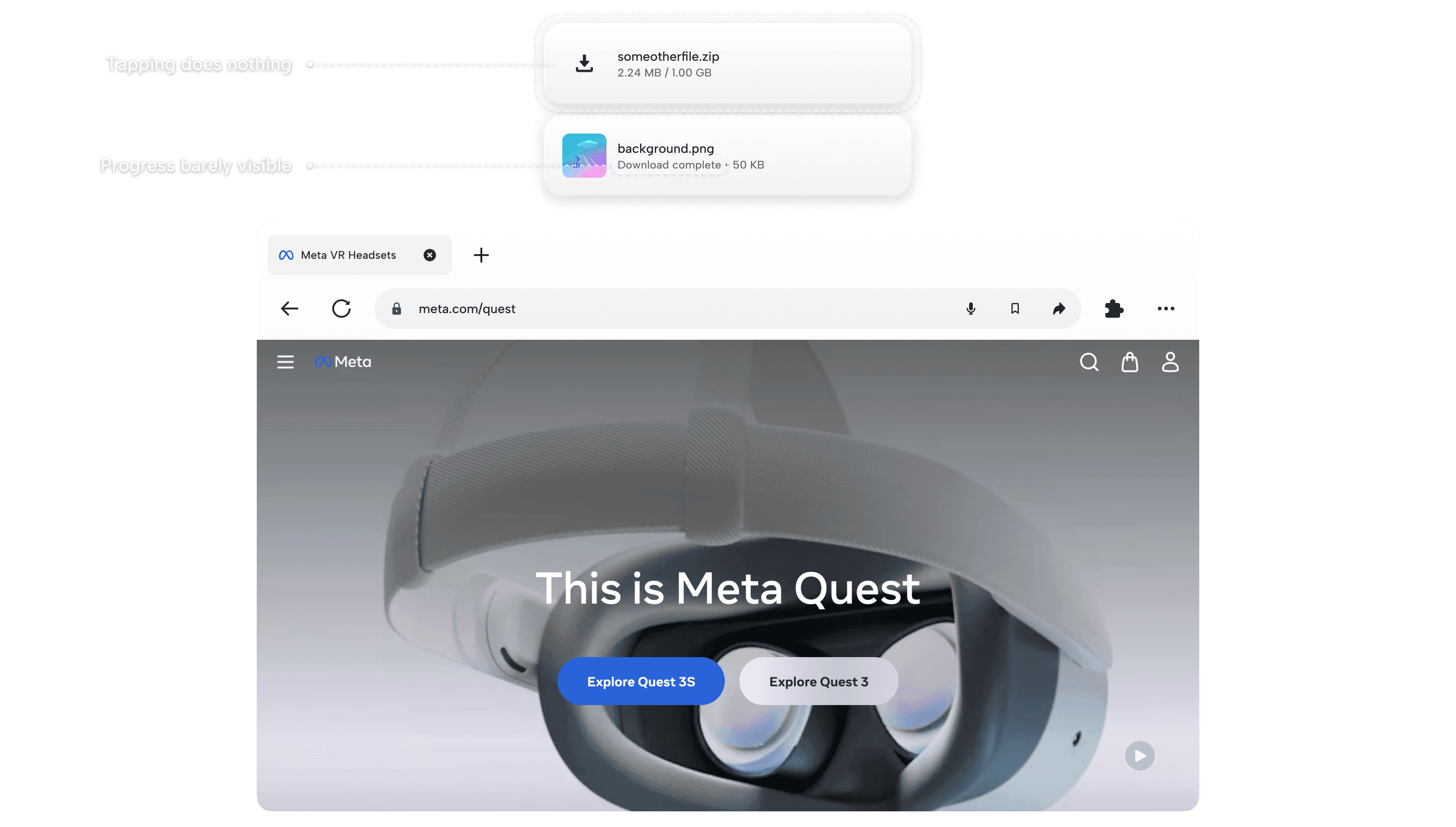 Quest Browser used system toasts to show download progress and completion. Progress was communicated through raw text updating byte counts in the toast. Easy to miss, especially in VR. When a download completed, a new toast appeared, but tapping it did nothing. The functionality was broken. On Quest, recovering from a missed toast means opening the Notifications app, a process that takes multiple steps to reach. In a spatial environment where you're already focused on something else, that friction is enough to make most people give up. I audited the full experience and pushed to expand the scope.