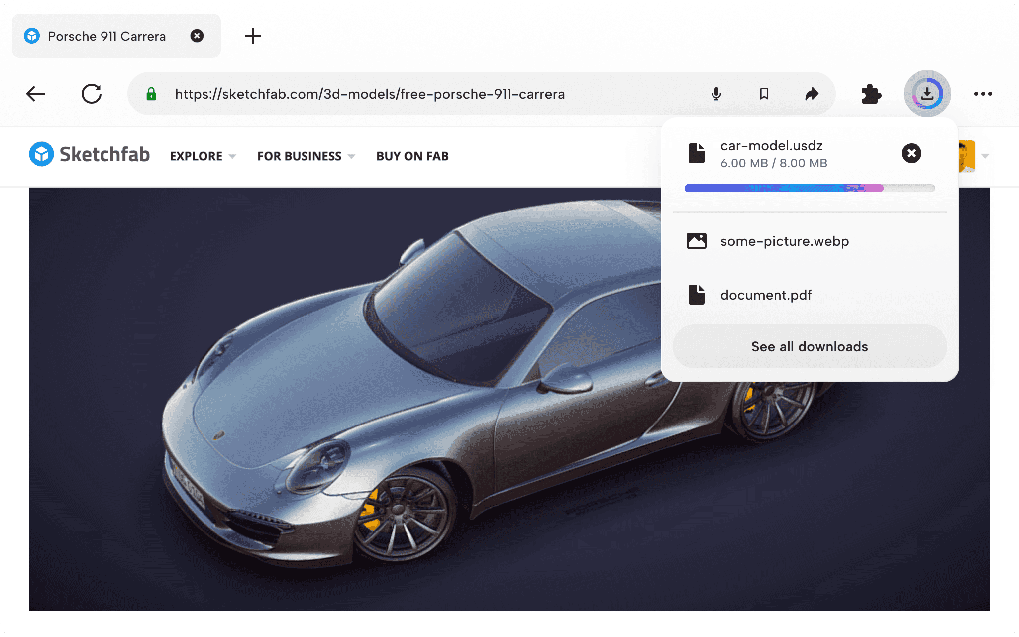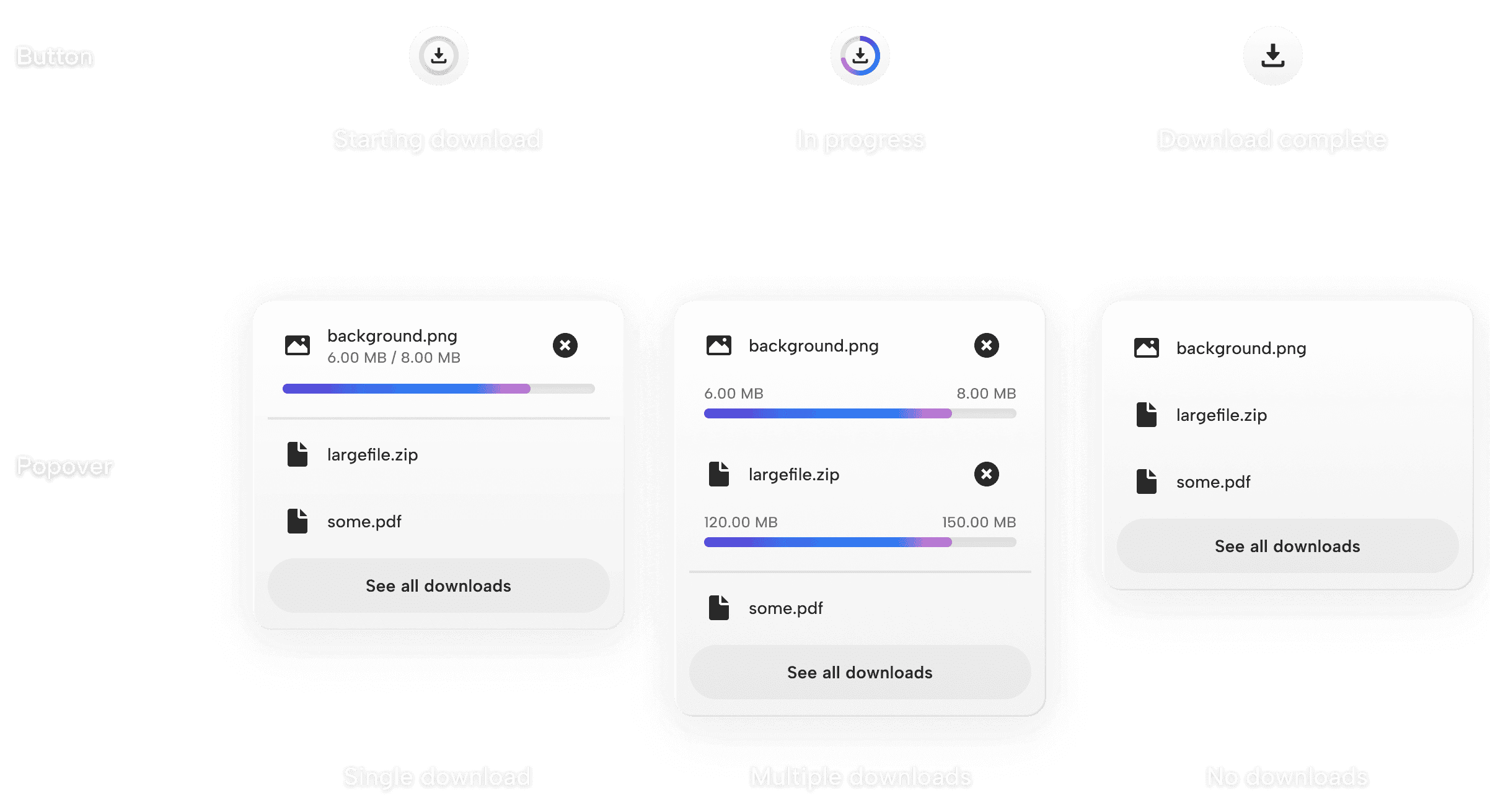 A new download button in the browser NavUI with a progress ring reflecting total download progress. Tapping it opens a popover with the three most recent downloads, in-progress states included. On completion, the popover opens automatically. The button persists until you act, then clears after ten minutes.